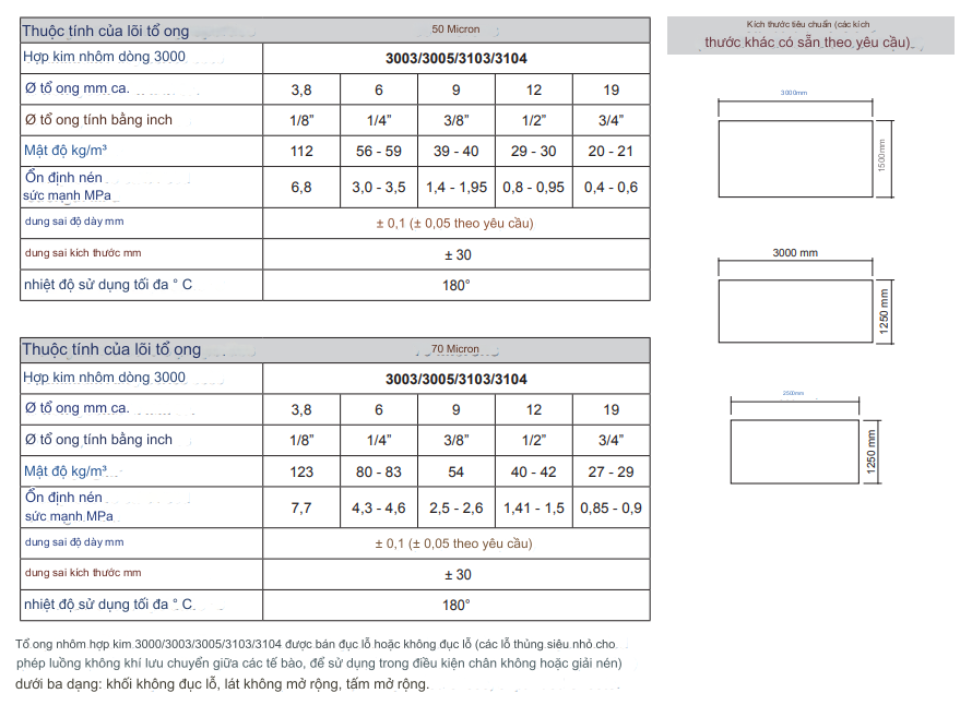 Thông số kỹ thuật của lõi nhôm tổ ong – Aluminum honeycomb core