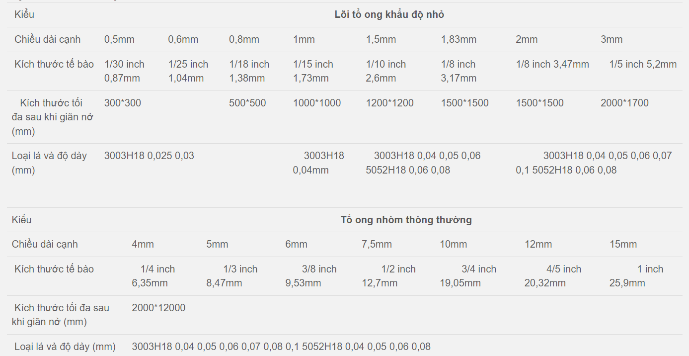 Tùy theo từng tiêu chuẩn mà lõi nhôm tổ ong có chiều dài cạnh từ: 0.3mm đến 3mm tương ứng với kích thước tổ ong từ 0.87mm đến 5.2mm. Ngoài ra, độ dày lá nhôm cũng dao động từ 0.03mm đến 0.08mm