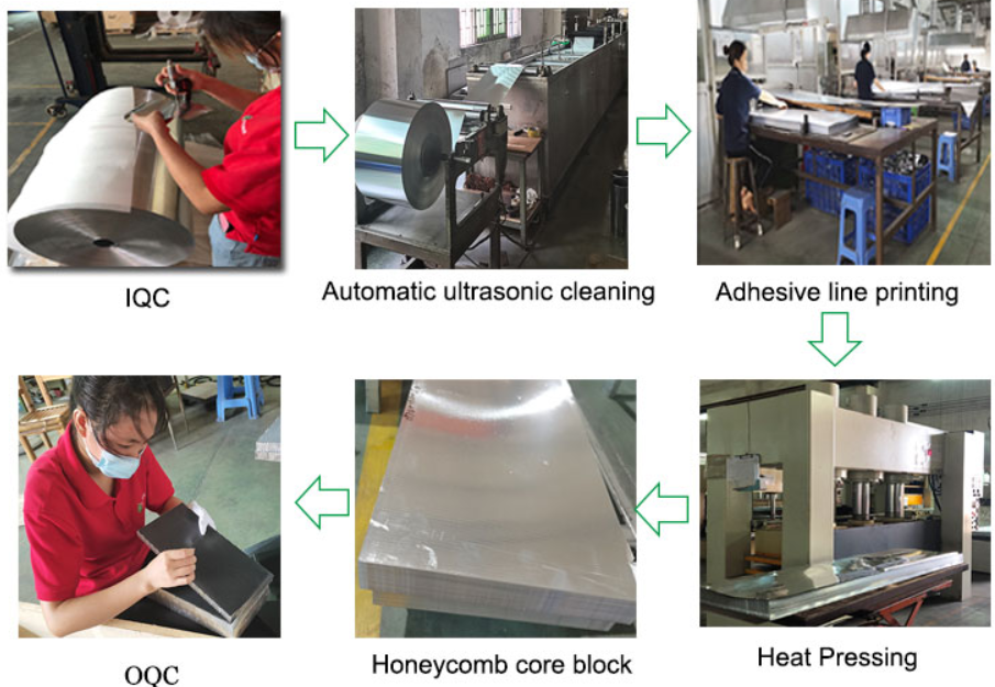 • Các tấm nhôm mỏng được xếp chồng lên nhau, phủ keo tại các điểm kết nối để tạo thành một khối nhôm đồng nhất.