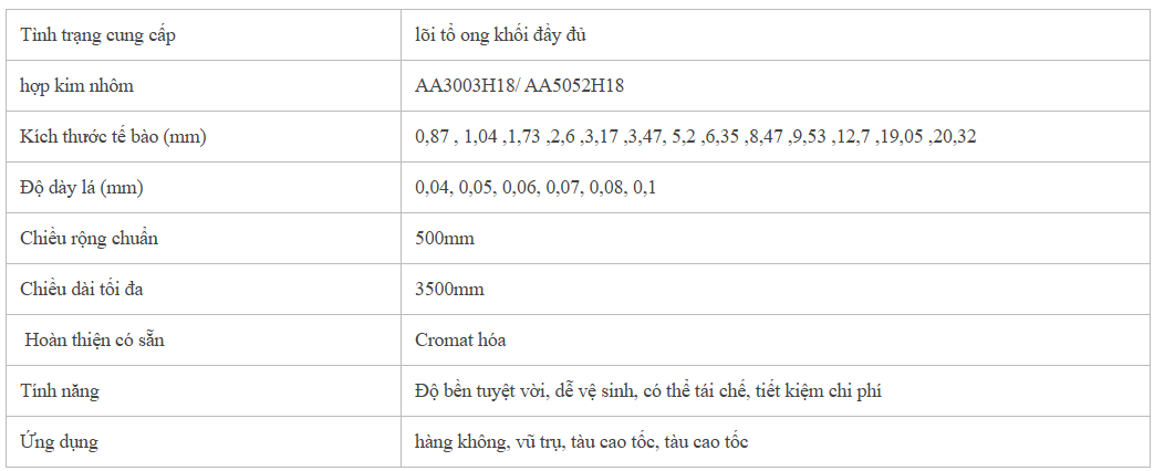 • Do chưa được mở rộng, khối tổ ong nhôm chiếm ít không gian hơn so với dạng lõi tổ ong đã mở rộng.