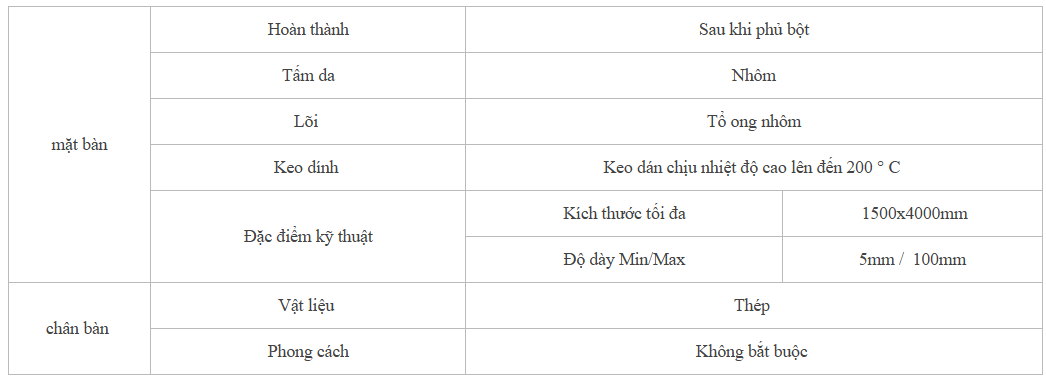 | Tiêu chí | Mặt bàn nhôm tổ ong sơn tĩnh điện | Mặt bàn kim loại thường | Mặt bàn gỗ tự nhiên | Mặt bàn nhựa giả gỗ |