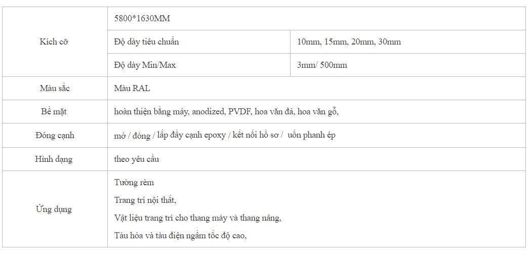- Đa dạng bề mặt, màu sắc và độ dày: Tấm nhôm tổ ong có kích thước tấm là 5800*1630 mm, độ dày đa dạng từ 10mm-15mm-20mm-30mm. Màu sắc phong phú, hơn nữa bề mặt có thể xử lý đa dạng như: PVDF, hoa văn đá, hoa văn gỗ