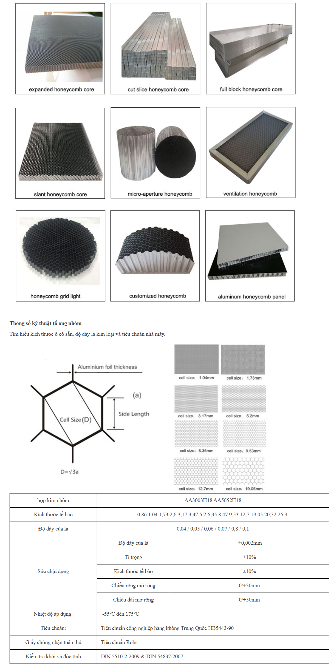 - Lõi tổ ong nhôm nhỏ (3-6mm): Chịu lực tốt, thường dùng cho hàng không, ô tô.