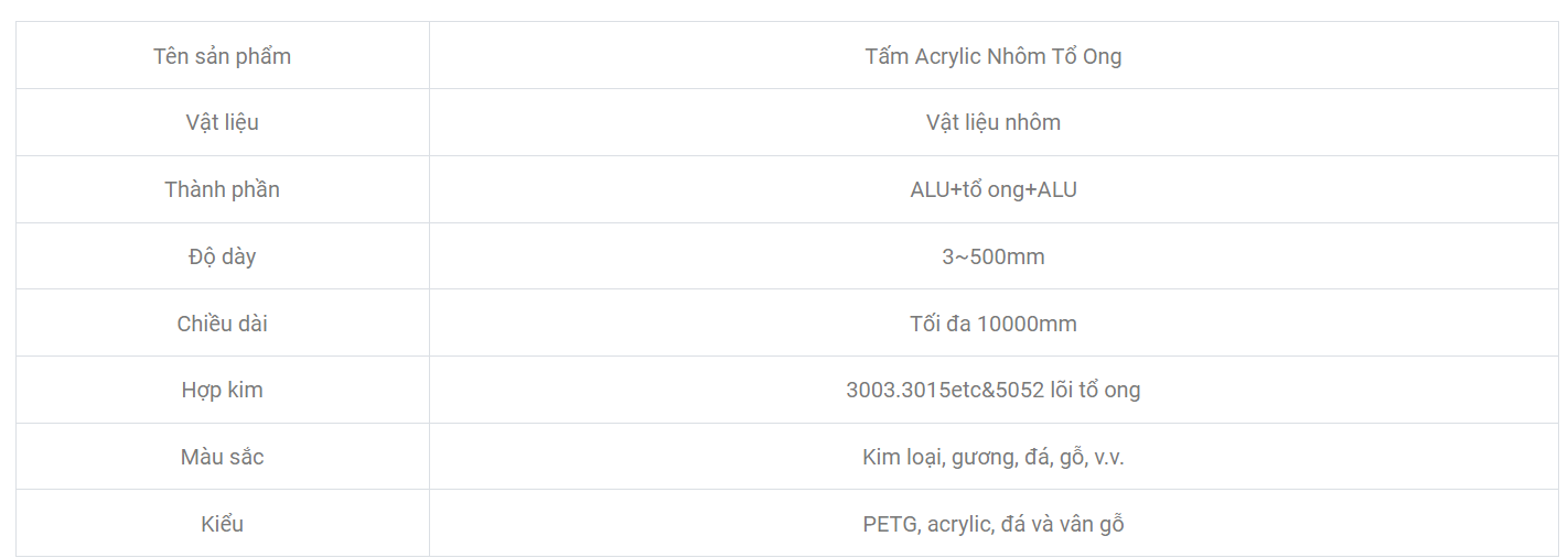 Thông số kỹ thuật của tấm nhôm tổ ong phủ Acrylic